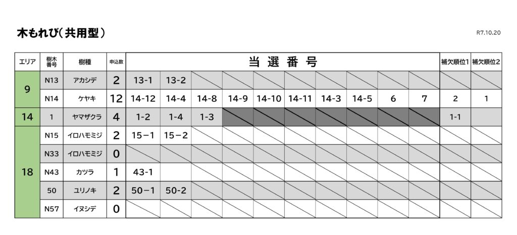 お知らせ・ブログ ホームお知らせ・ブログ樹木葬 第7期募集の抽選結果について お知らせ 2025.10.20 樹木葬 第7期募集の抽選結果について 大阪北摂霊園の樹木葬「木もれびと星の里」の第7期募集が終了しました。多くのお申込みをいただき誠にありがとうございました。 本日(10/20)、10時から大阪北摂霊園管理事務所2階において公開抽選を行いました。 抽選結果はこちらです。 当選された方には手続き書類をお送りいたしますので、11月28日(金)までにお手続きをお願いいたします。 お知らせ・ブログ一覧へ戻る お墓に関するご相談・お問合せ ご相談・お問合せ