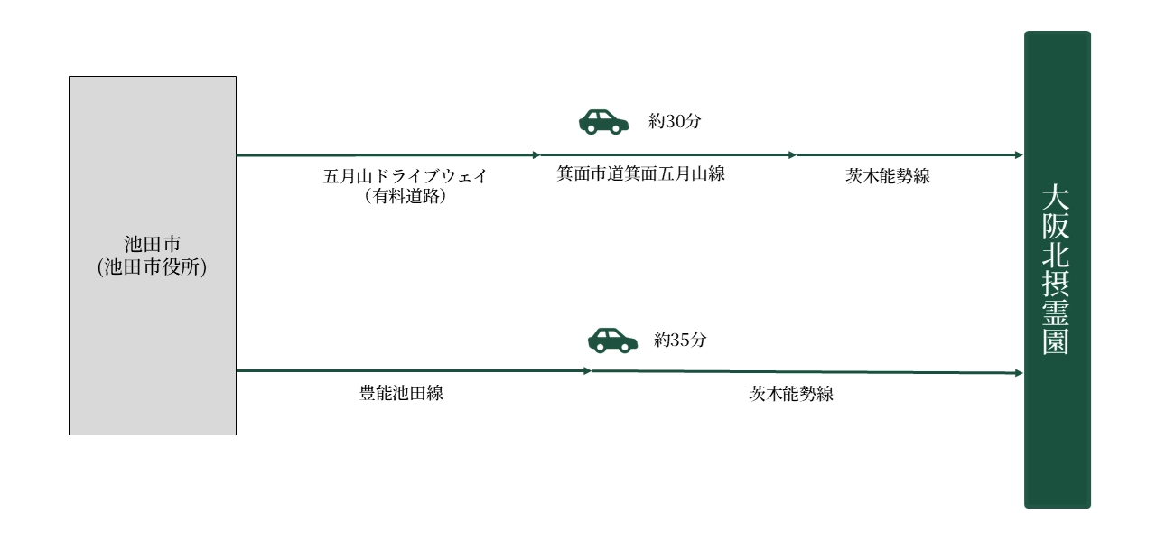 ※霊園内には墓所の近くまで、車が乗り入れできる駐車場がございます。 - 五月山ドライブウェイ経由:約30分