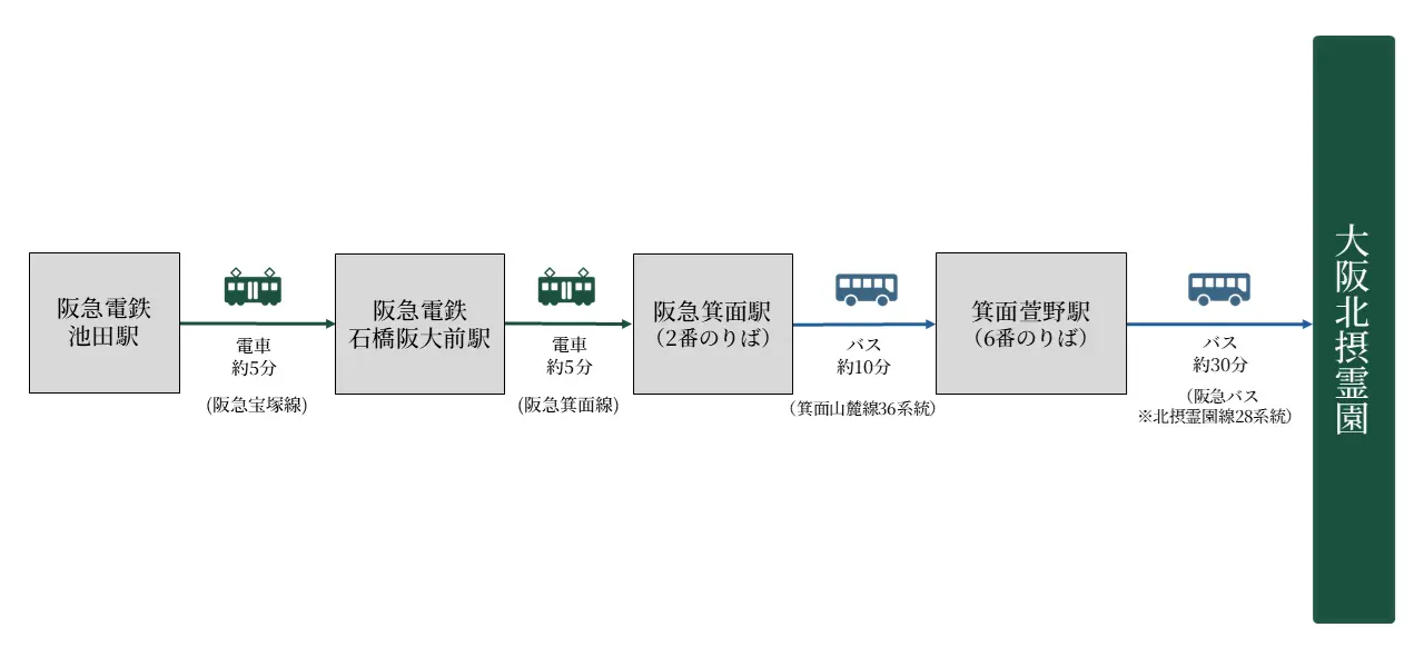 阪急バス 「箕面萱野駅」 → 「霊園事務所前」(大阪北摂霊園)(北摂霊園線28系統/6番のりば):約30分 - 料金の目安:約1,080円