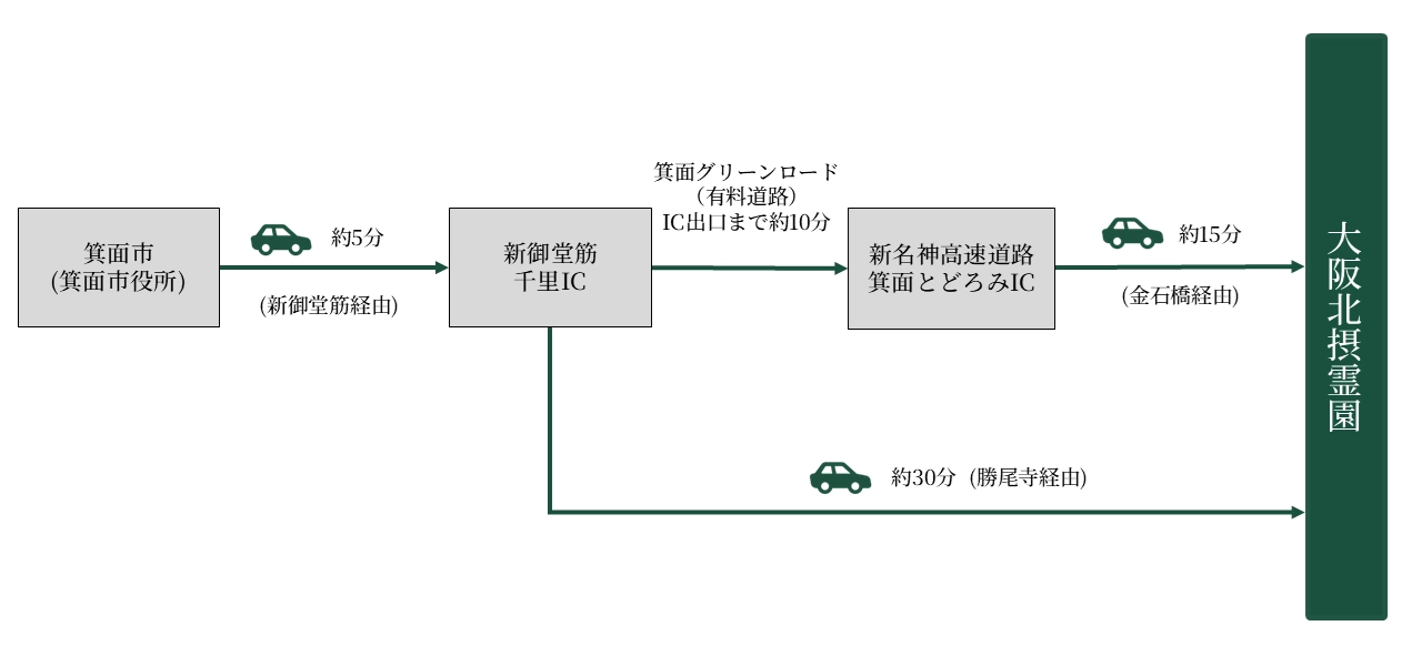 ※霊園内には墓所の近くまで、車が乗り入れできる駐車場がございます。 - 箕面グリーンロード経由:約30分