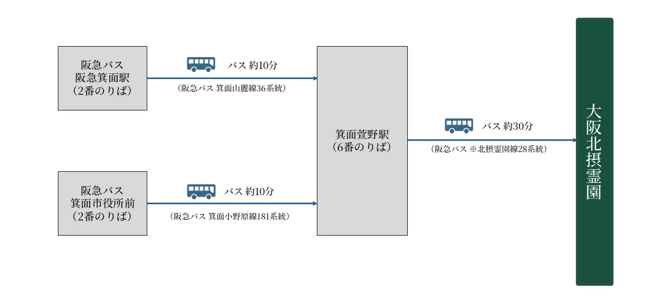 (北摂霊園線28系統/6番のりば):約30分 - 料金の目安:約880円